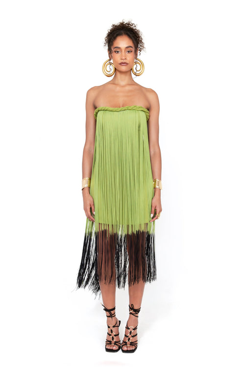 Where sculptural tailoring meets kinetic energy, The Leia Romper is a daring statement piece for the woman unafraid of movement and gaze. Cut in luminous chartreuse satin, its corseted bodice carves a powerful silhouette, while cascading fringe panels ripple with every step—evoking dance, rhythm, and untamed elegance.